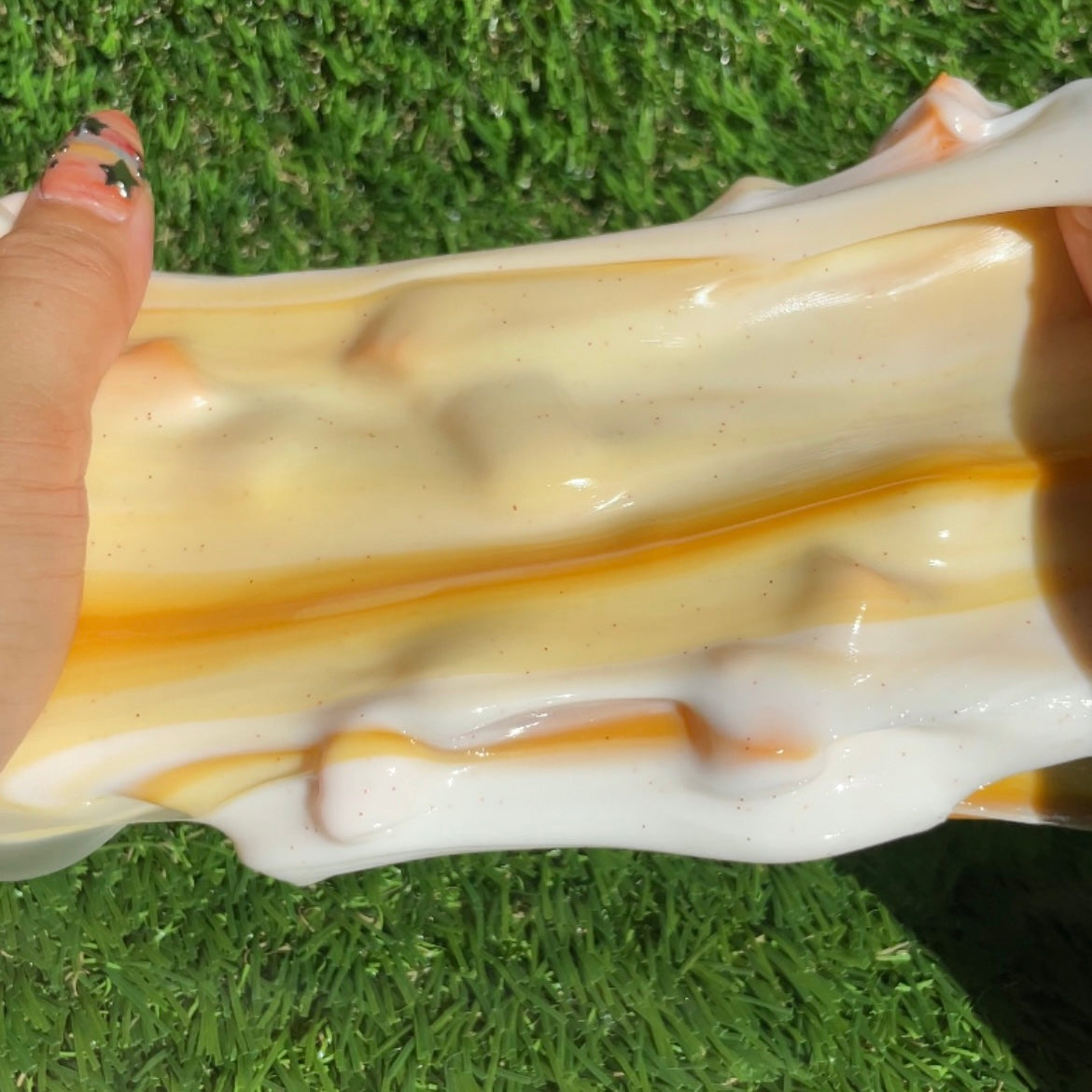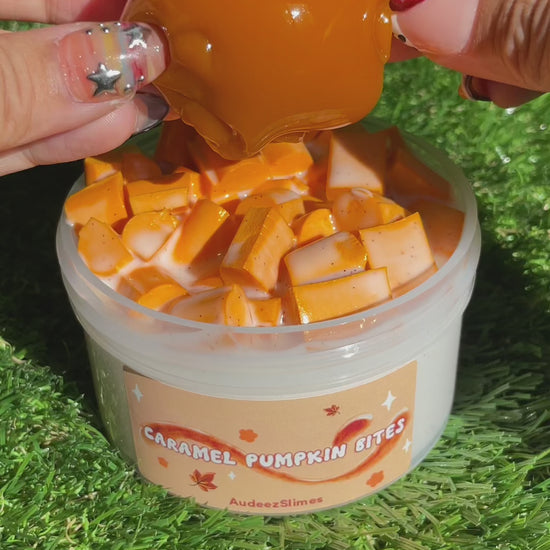 Caramel Pumpkin Bites invites you to enjoy a warm, spicy scent reminiscent of pumpkin cake topped with melted caramel. With a "caramel" topper included, you can decorate and personalize your slime for a sensory experience that feels festive, cozy, and comforting.