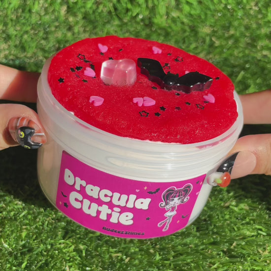 Dracula Cutie slime embodies the kind and chic spirit of the vegan vampire from Monster High. Featuring our iconic cream base topped with a hot pink icee top, this slime offers a unique experience. It has a chewy, tight stretch when mixing the two slimes, transforming into a smooth and creamy jelly texture once combined.