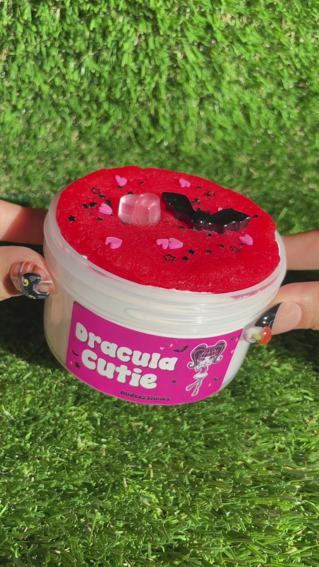 This slime includes hot pink and black sprinkles, a bat charm, and a pink jelly heart charm. Perfectly capturing her big heart, Dracula Cutie adds an elegant touch to your slime collection.