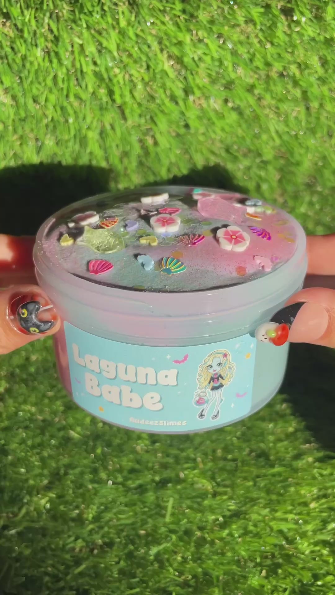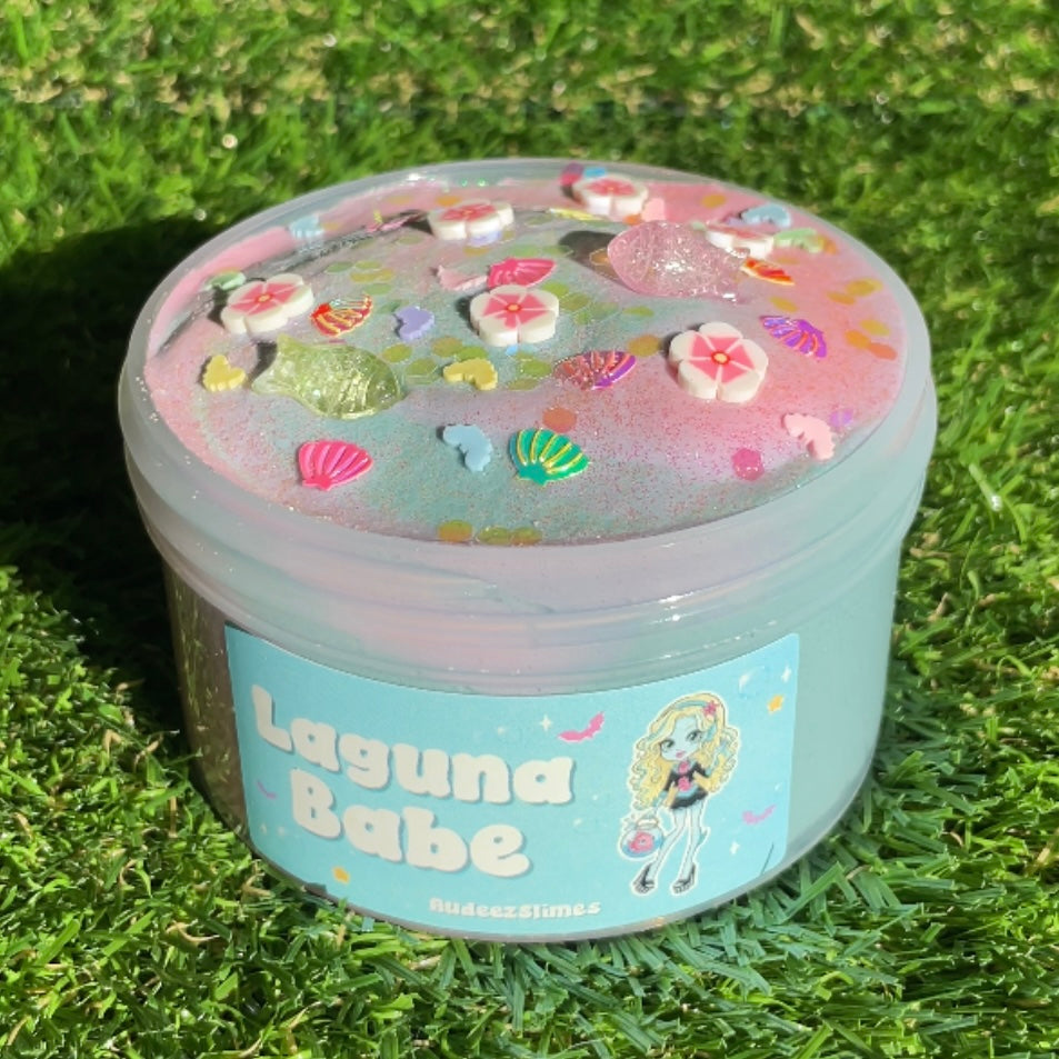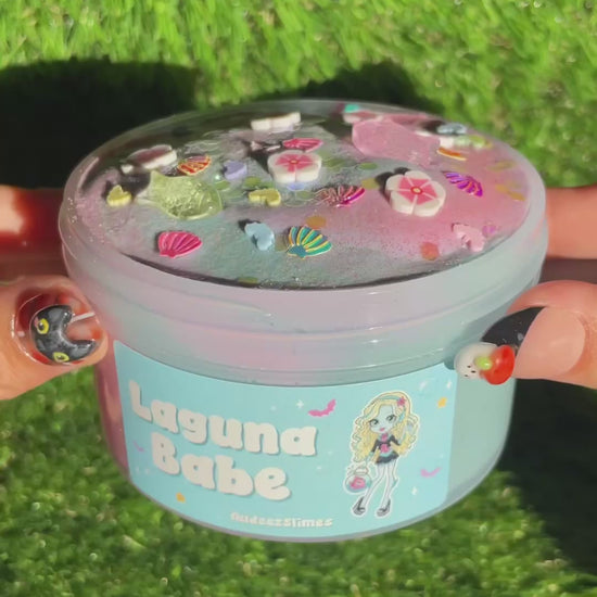 Laguna Babe draws inspiration from the charming teenage sea monster who cherishes the ocean. This elegantly crafted slime features two little fish charms, seashells, blossoms, pastel bats, and shimmering glitter scales, perfectly capturing her uniquely cool and graceful spirit.